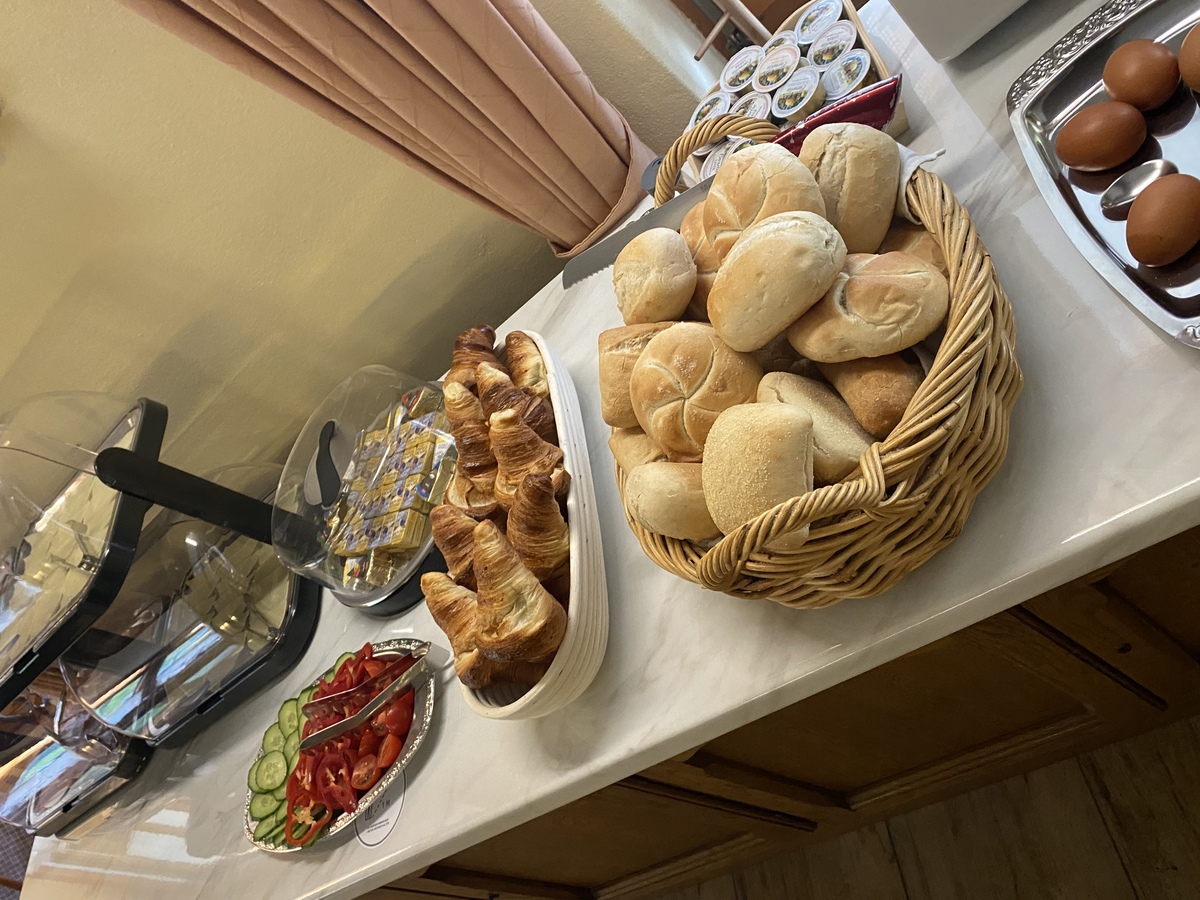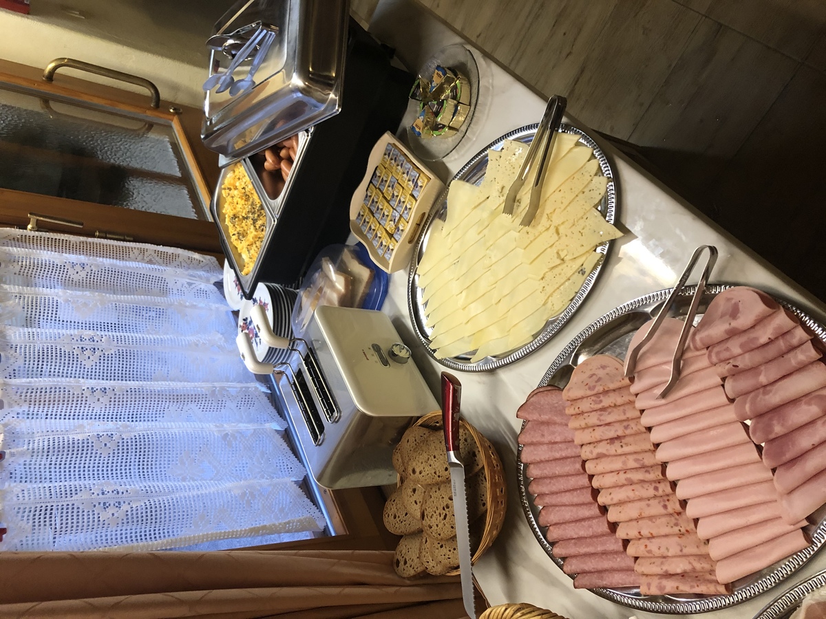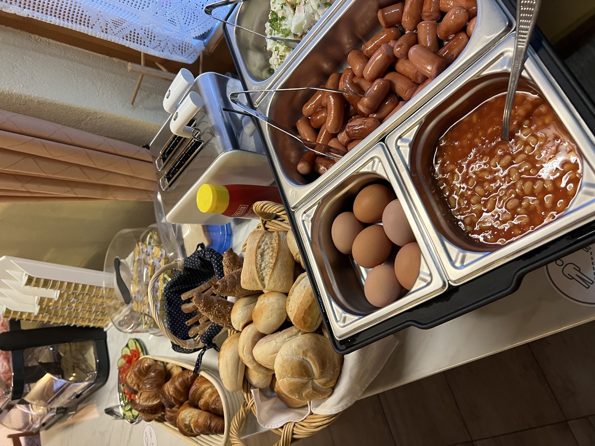 Von 07:30 bis 10:00 Uhr servieren wir ein Frühstück, bei dem nichts fehlen darf. Selbst gebackenes Brot, Croissants , Joghurts, Müsli... Sie haben die (Aus-)Wahl. Außerdem: frisches Obst, Wurst- und Schinkenspezialitäten und verschiedene Käsesorten. Ebenfalls erhältlich ist unser warmes Buffet, das verschiedene Eiersorten / Rührei, gekochte Eier/, Würstchen bietet.