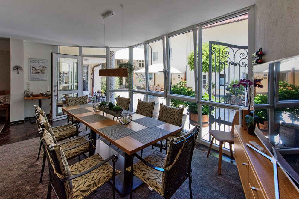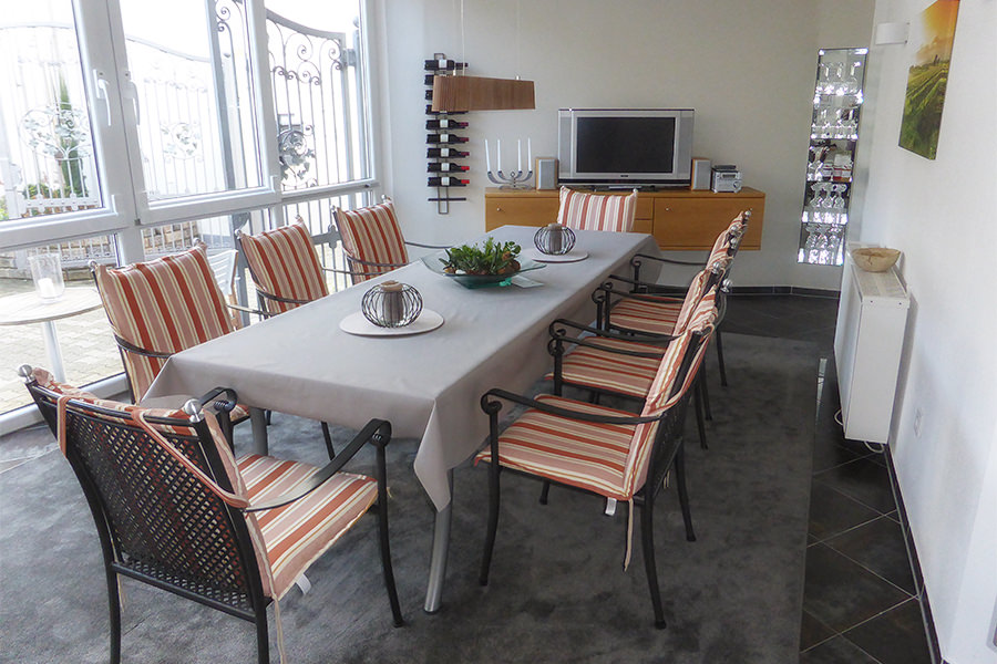 In unserem Wintergarten servieren wir Ihnen auf Wunsch ein reichhaltiges Frühstück. Der Wintergarten ist außerdem großzügig eingerichtet.